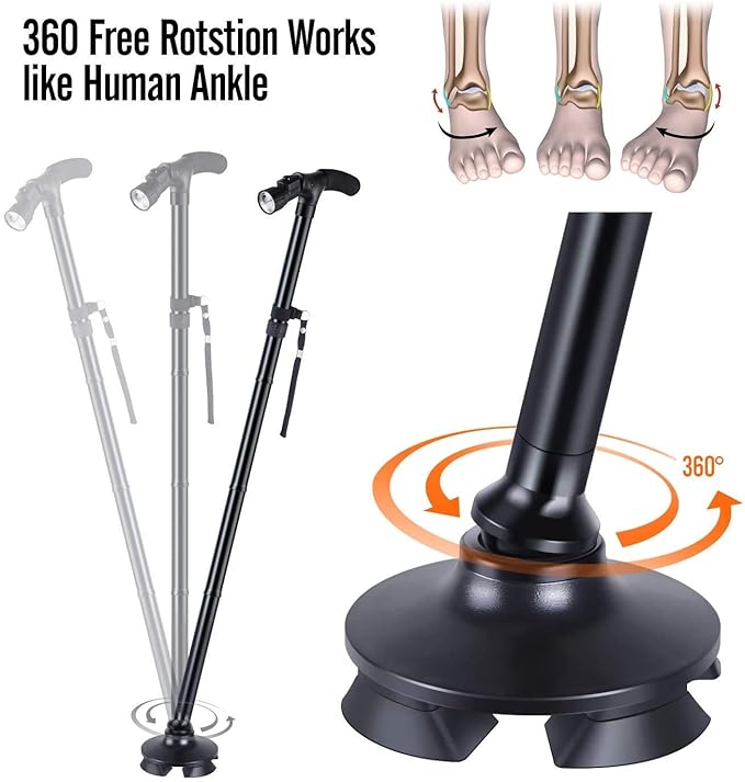 NON-SLIP FREE STANDING RUBBER BASE : The folding walking cane's 4 cane tipprotectors increase safety on varying terrain, hand stick, walking stick for women, this cane can stand up on its own for quick and easy access. Helps prevent the user from having to bend over to pick up the cane and risk falls